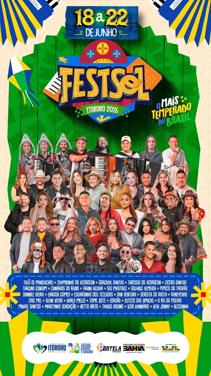 Tradição e Cultura – Além dos shows, o Festsol 2026 mantém viva a essência da cultura nordestina. A decoração temática, que já é marca registrada da cidade, promete transformar Itororó em um cenário de cores e sabores. O evento conta com o apoio do Governo do Estado da Bahia e do Ministério do Turismo, reforçando a importância da festa para a economia e o turismo da região. ”O Festsol não é apenas uma festa, é a alma de Itororó. Em 2026, estamos elevando o nível para entregar ao nosso povo e aos visitantes uma experiência inesquecível”, afirma a organização.