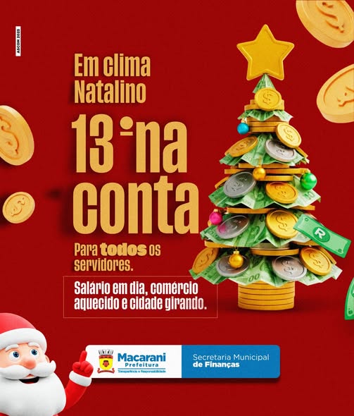 “Em clima natalino, compromisso em dia! A Prefeitura de Macarani realizou o pagamento do 13º na conta para todos os servidores, garantindo salário em dia, valorização do funcionalismo e mais movimento no comércio local. “