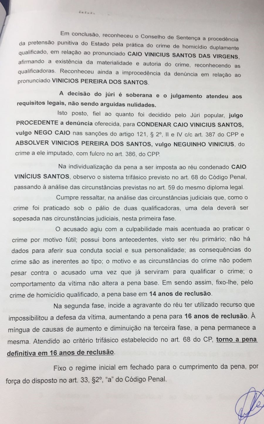 apontado como coautor do homicídio. Mas decidiu pela condenação de Caio Vinícius Pereira Santos, a 16 anos de prisão em