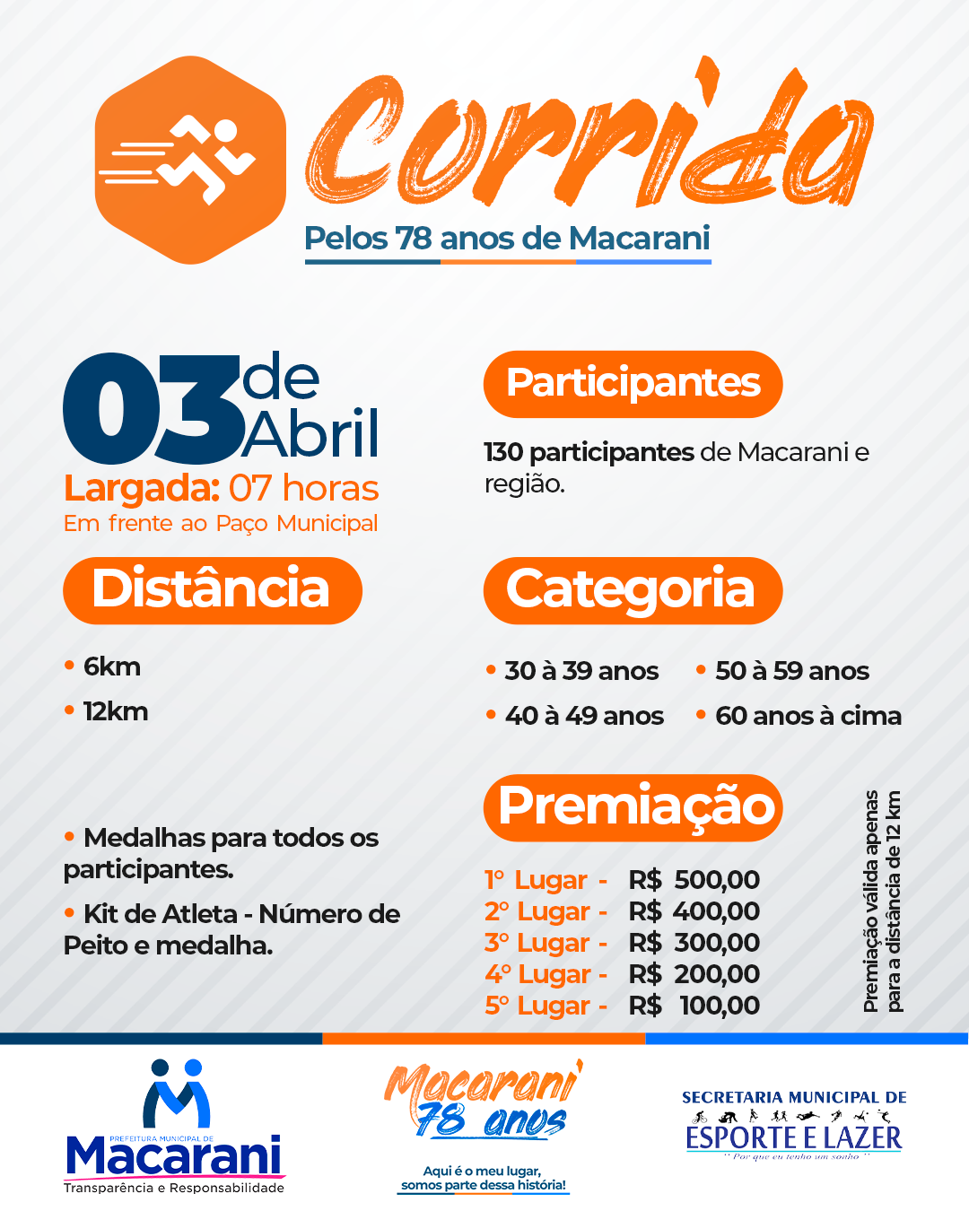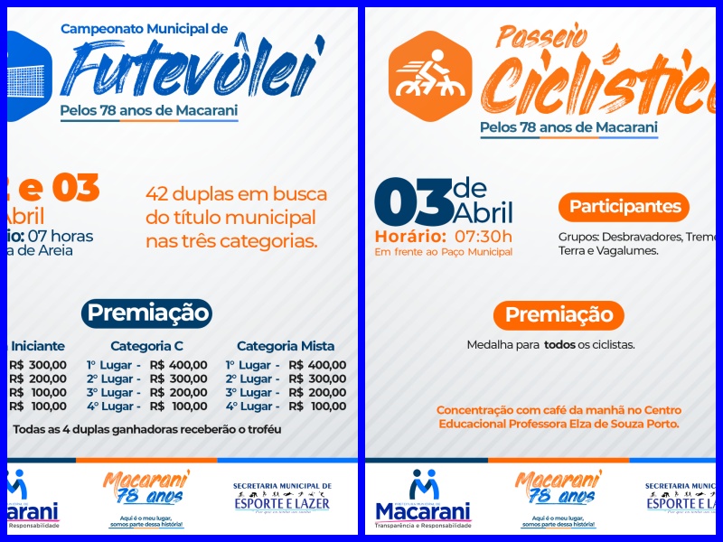 Secretaria Municipal de Esporte e Lazer de Macarani, definiu a premiação das modalidades esportivas que integrarão a programação das comemorações do aniversário da cidade no dia 03 de abril. A corrida terá várias categorias num total de 130 corredores e terá premiação aos participantes, uma vez que o Passeio Ciclístico não é competição e o Futevôlei será o I Campeonato Municipal e já tem as duplas inscritas para a competição que terá duração de dois dias.