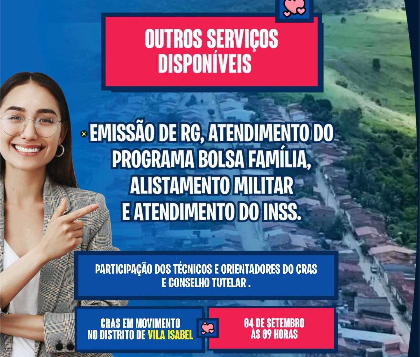 Depois do Distrito de Itabaí, a Prefeitura de Macarani através do CRAS e da Secretaria de Assistência Social volta toda as atenções para o Distrito de Vila Isabel. A Vila receberá nesta próxima quinta-feira 04 de setembro a visita da cavana do programa “CRAS EM MOVIMENTO”, que levará diversas ações tanto na área da saúde, beleza e cidadania com atendimento gratuíto em todos os setores.