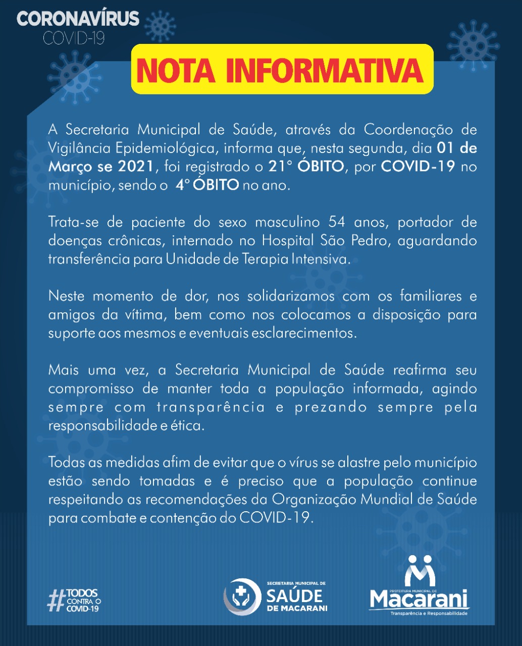 Nesta quarta-feira, a Secretaria de Saúde de Macarani, emitiu um novo boletim informando o avanço da doença no Município. E acreditem: a proporção em relação a 2020 onde foram registrados 16 mortes até dezembro é alarmante para apenas dois meses no ano e preocupante.