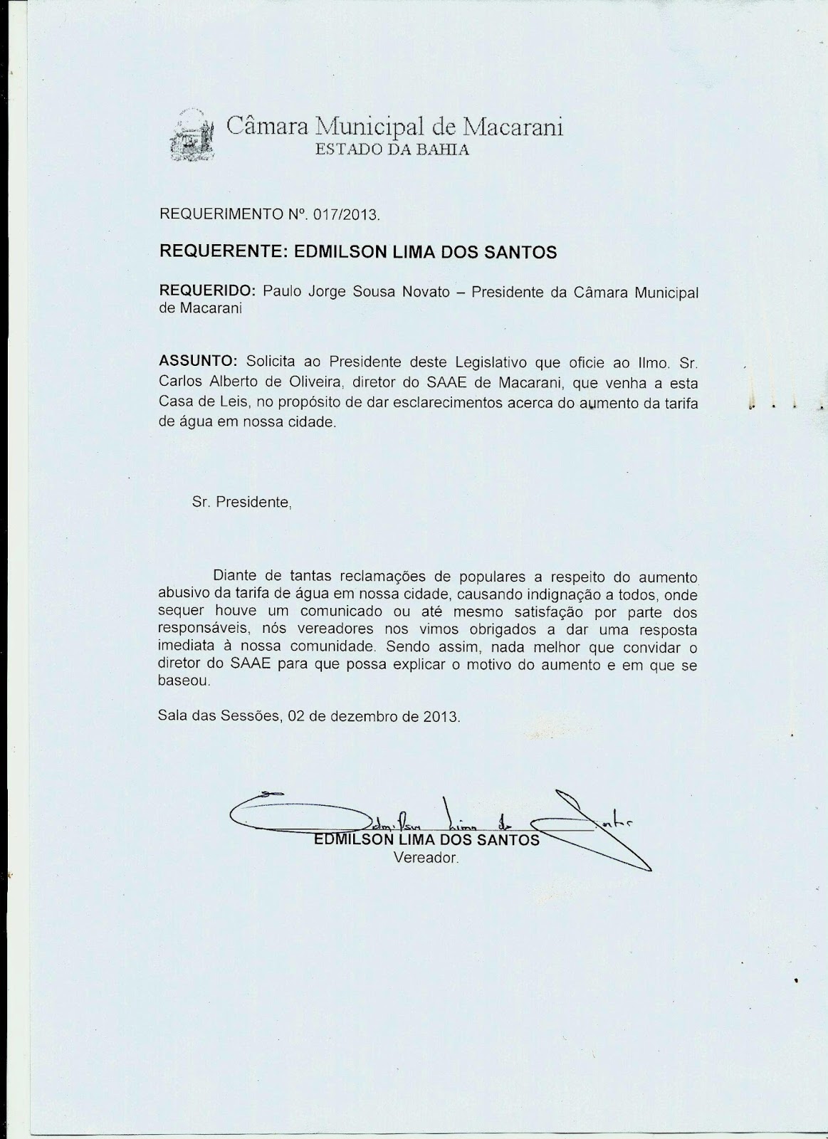 Presidente do Legislativo (Jorge Motos), que convoque o Diretor do SAAE (Carlos