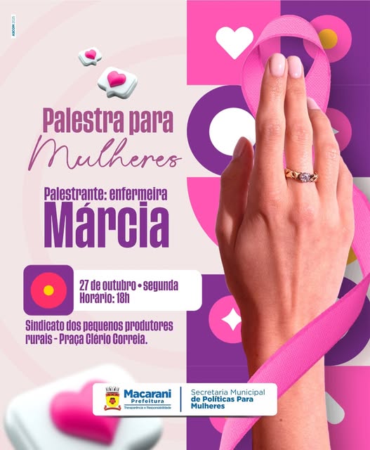 A Prefeitura de Macarani, através da Secretaria Municipal de Políticas para Mulheres, convida todas para um encontro especial com a enfermeira Márcia, nesta segunda-feira, 27 de outubro, às 18h, no Sindicato dos Pequenos Produtores Rurais (Praça Clério Correia). Será um momento de acolhimento, aprendizado e troca de experiências voltado à saúde e ao bem-estar feminino.