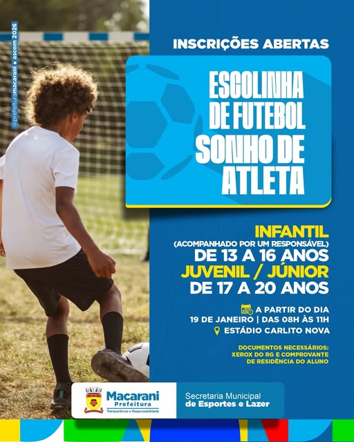 “Seguimos trabalhando com responsabilidade e união para ampliar ações e oportunidades para nossa gente.” Falando nisso: Chegou a hora de correr atrás do sonho! Estão abertas as inscrições para a Escolinha de Futebol Sonho de Atleta, da Secretaria Municipal de Esportes e Lazer.