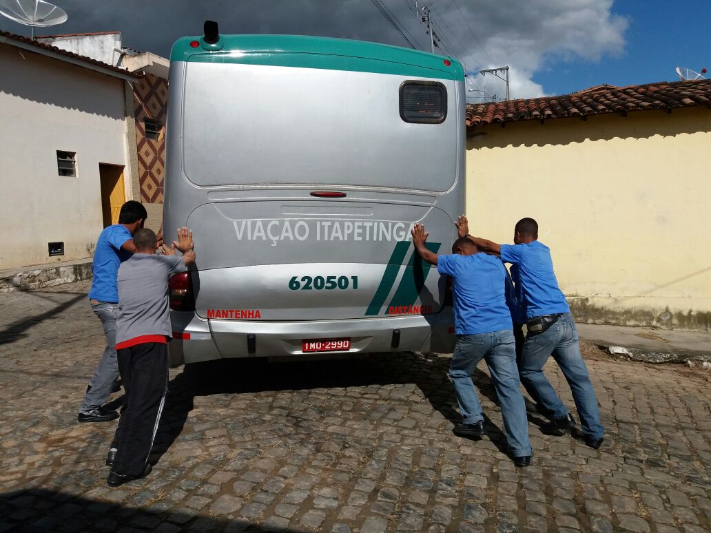 funcionários tiveram que descer e empurrar o ônibus ladeira acima com problemas
