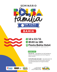 Acontece nestes dias 12 e 13 de novembro, a partir de 08h30, no Fiesta Bahia Hotel, Itaigara, Salvador, o seminário “Bolsa Família em Ação na Bahia”. O encontro tem como objetivo qualificar gestões e coordenações municipais sobre o programa, abordando temas como benefícios, condicionalidades, planejamento e administração, gestão financeira, entre outros aspectos. O seminário será realizado em formato de palestras, abordando temáticas como trajetória, desafios, avanços, ferramentas de gestão, resultados, intersetorialidade e intrasetorialidade, equidade e acompanhamento educacional, cobertura na saúde das famílias beneficiárias do Programa Bolsa Família (PBF), Índice de Gestão Descentralizada (IGD) e Cadastro Único.