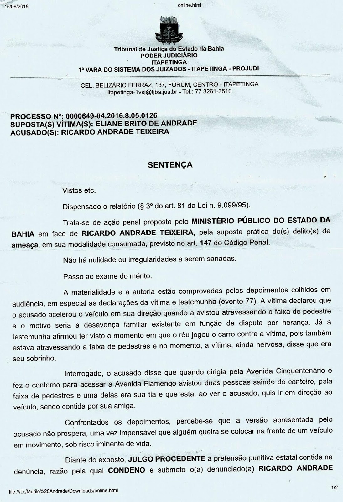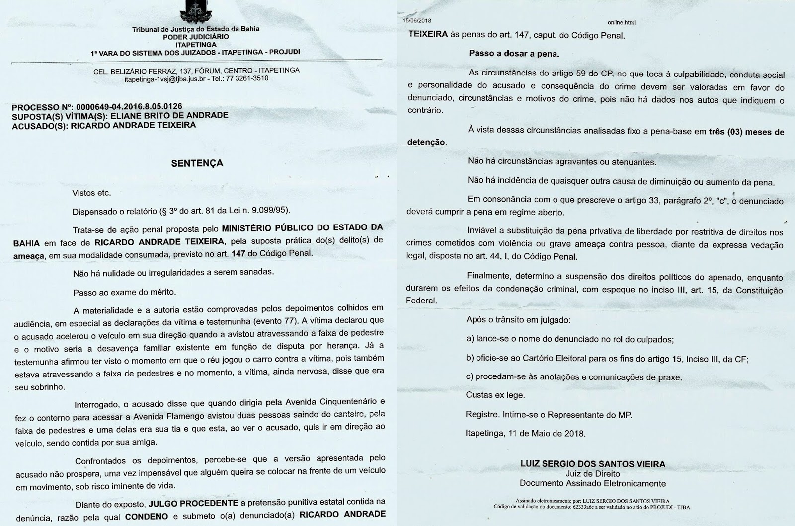 não foi aceito pela Justiça, e no último dia 11 de maio de 2018, o Juiz Dr. Luiz Sérgio Dos Santos Vieira, deu a sentença baseado