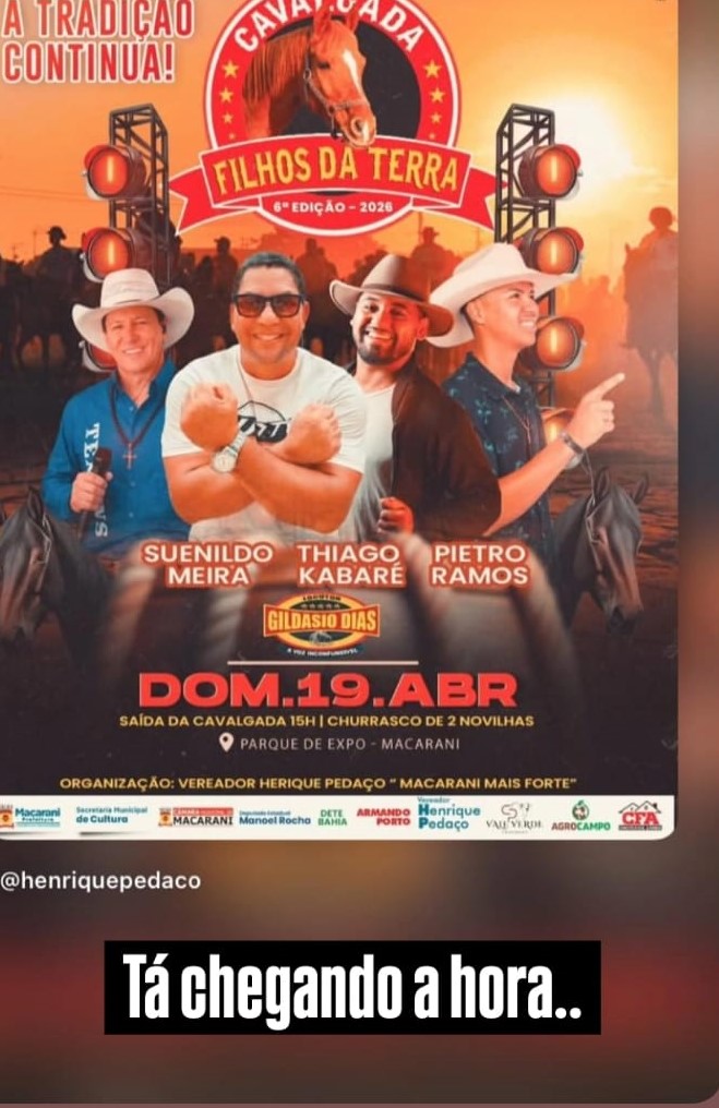 Pois é, neste domingo dia 19 de abril Macarani vai estar em festa mais uma vez com o a reunião dos cavaleiros, amazonas, amigos e amigas que estarão em mais um encontro no Parque Zé Caixeiro para a sexta edição da Cavalgada Filhos da Terra. Evento que realiza sempre uma série de homenagens aos pioneiros que construiram a História de Macarani nestes 82 anos.