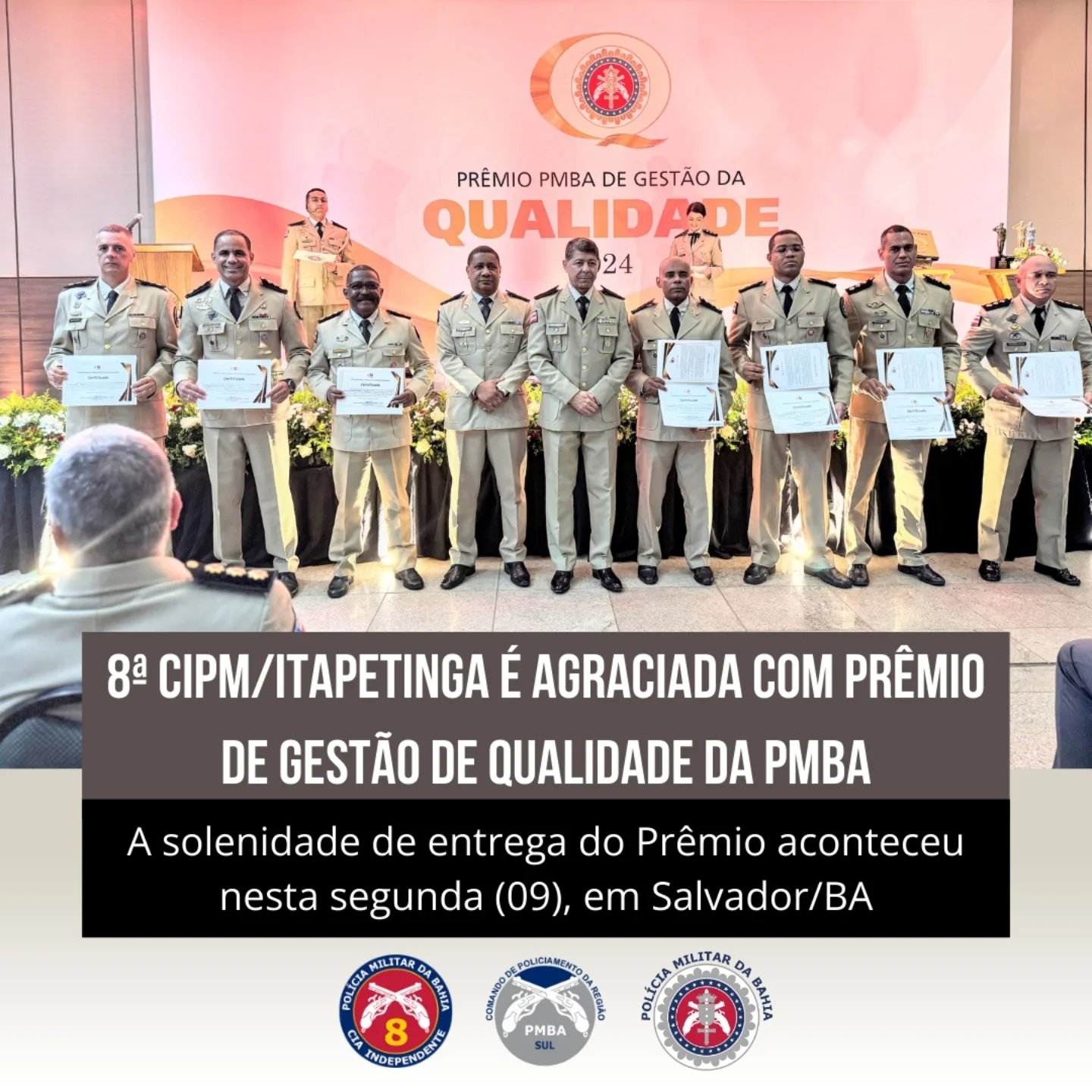 PARABÉNS – 8ª CIPM é agraciada com Prêmio de Gestão de Qualidade da PMBA. Neta segunda-feira (09) foi realizada em Salvador/BA a solenidade de entrega do Premio Gestão de Qualidade PMBA. A 8ª CIPM/Itapetinga está entre as 86 unidades que alcançaram o prêmio.