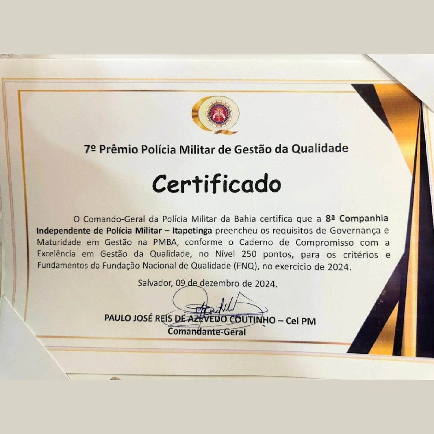 A 8ª CIPM alcançou pela primeira vez a certificação, após empenho do Comandante da Unidade, Major PM Alécio Marques de Andrade, e da dedicação e esforço de oficias e praças da Unidade.