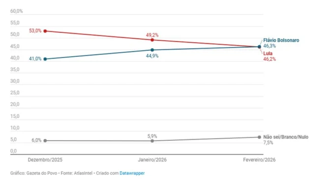 Segundo a pesquisa da AtlasIntel deste mês, 51,5% dos entrevistados disseram que desaprovam o presidente Lula, enquanto 46,6% afirmaram aprovar. No mês anterior, os números eram de 50,7% de desaprovação e 48,7% de aprovação. Na questão de avaliação, 47,1% consideravam o governo Lula ótimo ou bom em janeiro, caindo para 42,7% em fevereiro. Além disso, uma pergunta específica da pesquisa feita para os entrevistados questionava sobre qual resultado causaria mais medo ou preocupação. A reeleição de Lula foi citada por 47,5%, enquanto a eleição de Flávio foi escolhida por 44,9%.