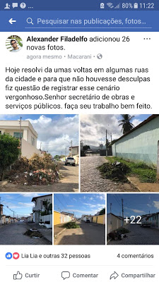 fotos tiradas por ele mesmo, a incompetência da administração municipal  através do Secretário de Obras  Eliomar Sousa (Liora) em cuidar