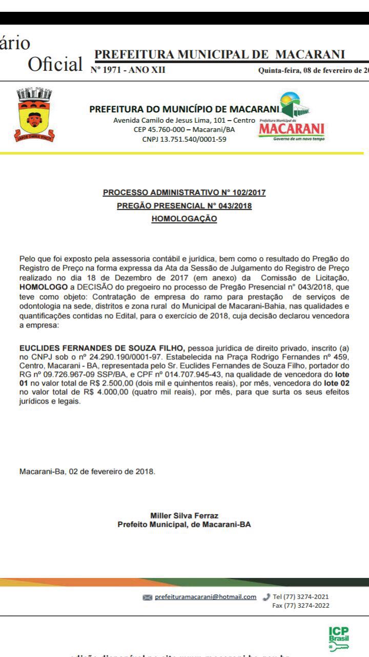 Euclides Fernandes Filho, conseguiu ganhar dois lotes da licitação em pregão presencial que contratava