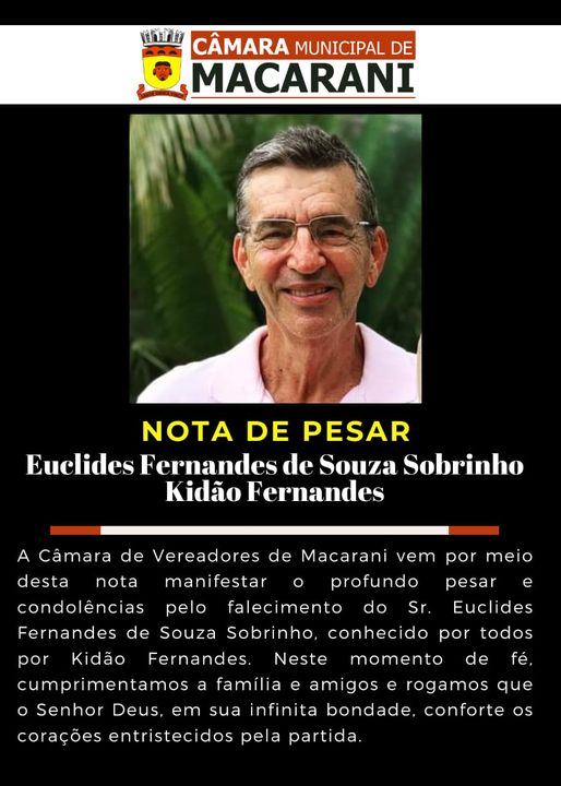 O final de semana em Macarani foi triste e de luto, a cidade perdeu mais um membro da tradicional Família Fernandes, uma das pioneiras na formação da cidade. Desta vez, se foi o ex-vereador Euclides Fernandes de Sousa Sobrinho, o conhecidíssimo Kidão Fernandes. O falecimento ocorreu na noite de sábado 06, o corpo foi velado na Câmara de Vereadores e sepultado neste domingo a tarde.